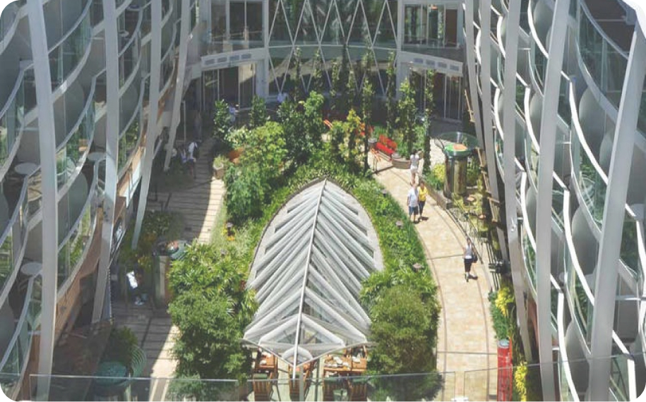 - Central Park — відкрита палуба зі справжнім садом та квітником, на якій багато ресторанів та магазинів