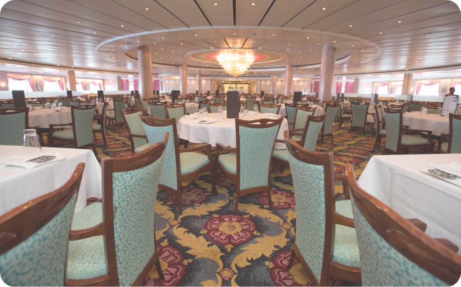 Пасажири можуть скуштувати різноманітні страви у двох основних безкоштовних ресторанах Palace Restaurant та Crossings Restaurant, а також перекусити та випити у буфетах та кафе, взяти їжу з собою. Широкий вибір кулінарних вишукувань задовольнить усі смаки, меню нове щодня, страви від шеф-кухаря та ретельно відібрані рекомендації з вин та інших напоїв.