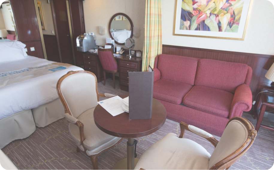 Пасажирам пропонують комфортабельні каюти 4-х категорій, які в свою чергу діляться на 4-6 типів. У кожній є ванна кімната (душ, туалет) з феном, зручні меблі, кондиціонер, холодильник, телевізор, телефон, сейф та інші речі, необхідні для комфортного проживання.